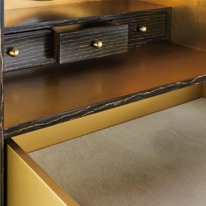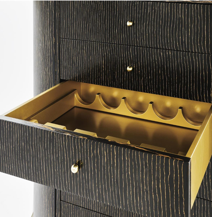 This Modern Armoire is more than just a storage solution; it’s a declaration of style and a testament to meticulous craftsmanship. Its ebony wood frame, subtly kissed with gold accents, immediately commands attention, setting a tone of refined elegance within any room. The centerpiece of this captivating piece is undoubtedly the gorgeous mirror, framed by an Antique Gold backdrop and illuminated by a dimmable LED backlight, creating a mesmerizing focal point that plays with light and shadow. Functionality is seamlessly blended with beauty, as the armoire boasts a combination of three petite drawers and six more substantial ones, each adorned with Polished Brass handles. Notably, two drawers are thoughtfully lined with plush velvet, ideal for safeguarding delicate items, while the remaining four transform into removable wine racks, capable of cradling five bottles each. The armoire is grounded by a stylishly curved base, trimmed in Antique Gold, further elevating its sophisticated aesthetic and solidifying its position as a true centerpiece of discerning taste.